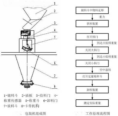 該顆粒包裝機(jī)由機(jī)架、給料器、稱料斗和電氣箱四部分組成。在對塑料顆粒、糧食、種子、炒貨、飼料等顆粒包裝工作開始時,本顆粒定量包裝機(jī)兩臺給料器同時對稱料斗喂料,喂料過程由控制儀表通過對傳感器輸出信號連續(xù)采樣,并隨時與大投值比較,當(dāng)料重不小于大投值時,自動停止大投給料器,剩下一臺小投給料器繼續(xù)細(xì)喂料,并與目標(biāo)值比較,當(dāng)料重接近目標(biāo)值時(稱重值=目標(biāo)值-落差值),停止喂料,等待操作者套袋,有套袋操作時,感應(yīng)開關(guān)向儀表送出開關(guān)信號,塑料顆粒包裝機(jī)卸料,無套袋操作時機(jī)器等待,直至套袋卸料。